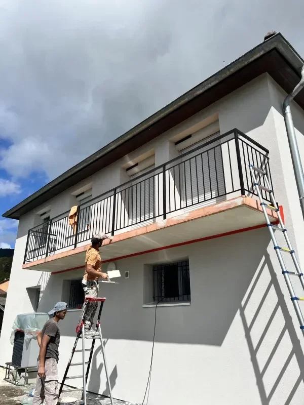 Photo illustrant des artisans de TMF TOITURE & FACADE en pleine rénovation de façade : ravalement complet, entretien et nettoyage, témoignant du savoir-faire et du sérieux de l'entreprise.
